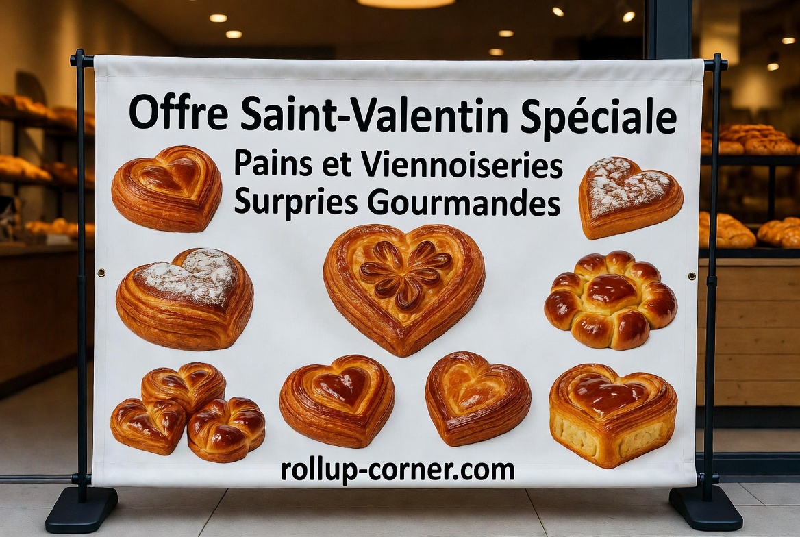 Vous êtes boulanger et cette année pour la Saint-Valentin vous avez décidé de réaliser des pâtisseries inédites en forme de cœur ainsi que des pains et des viennoiseries surprises. Vous avez commencé à prévenir oralement tous vos clients habituels et vous avez mis une affiche sur votre vitrine mais vous n’avez absolument pas les moyens financiers pour faire réaliser des flyers et les distribuer. Si vous êtes à la recherche d’une alternative efficace et moins coûteuse, ne perdez pas de temps pour vous rendre sur le site rollup-corner.com.
